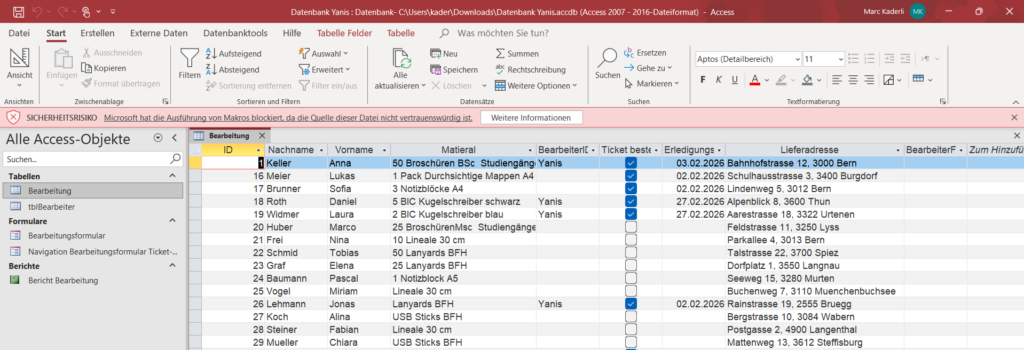 Im Berufsalltag können Datenbanken genutzt werden, um grössere Datenmengen übersichtlich zu verwalten, zum Beispiel Adressdaten, Inventarlisten oder Projektdaten. Besonders in der öffentlichen Verwaltung ist eine strukturierte Datenerfassung zentral, um effizient arbeiten zu können.